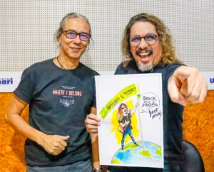Aproveitando a oportunidade, o desenhista presenteou o roqueiro e apresentador Claudio Wallace, com uma linda charge homenageando o Projeto ROCK MADE IN AMAZON.